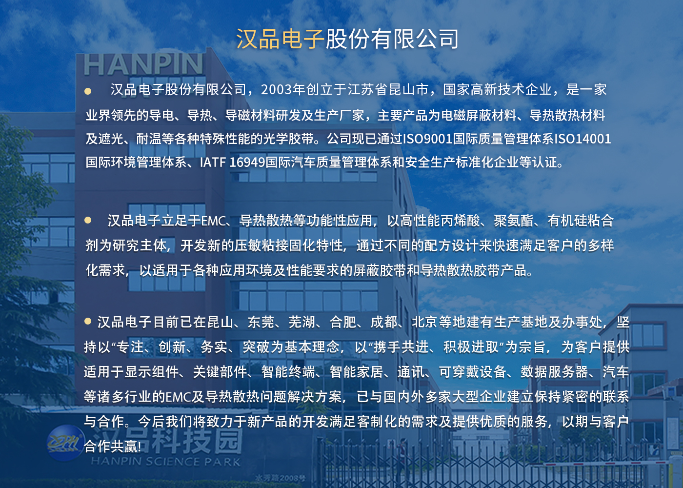 漢品電子股份有限公司,2003年創(chuàng)立于江蘇省昆山市,國家高新技術(shù)企業(yè),是一家業(yè)界領(lǐng)先的導(dǎo)電、導(dǎo)熱、導(dǎo)磁材料研發(fā)及生產(chǎn)廠家,主要產(chǎn)品為電磁屏蔽材料、導(dǎo)熱散熱材料及遮光、耐溫等各種特殊性能的光學(xué)膠帶。公司現(xiàn)已通過ISO9001國際質(zhì)量管理體系、ISO14001國際環(huán)境管理體系、IATF 16949國際汽車質(zhì)量管理體系和安全生產(chǎn)標(biāo)準(zhǔn)化企業(yè)等認(rèn)證。